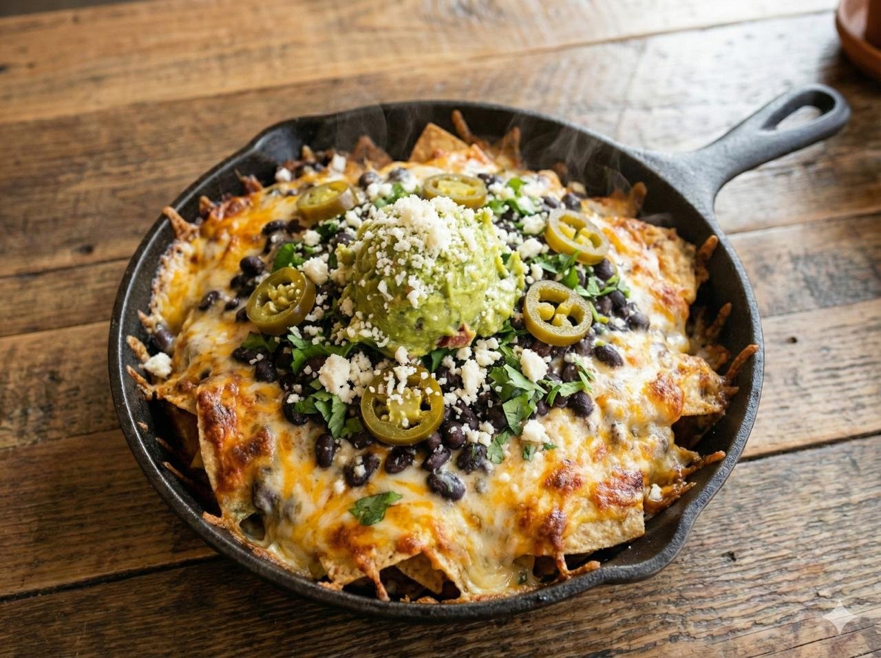 El equilibrio perfecto entre lo crujiente, lo cremoso y lo picante. Nuestros totopos artesanales se cubren con una capa abundante de queso gratinado y frijoles negros tiernos.